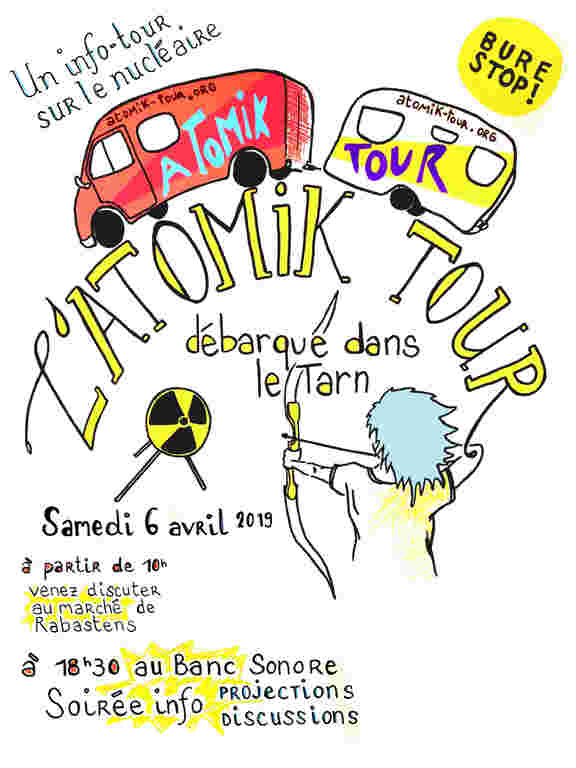 L'Atomik tour débarque dans le Tarn, et fait escale samedi 6 avril au Banc sonore à partir de 18H: Soirée d'informations contre le nucléaire avec projections et discussions.