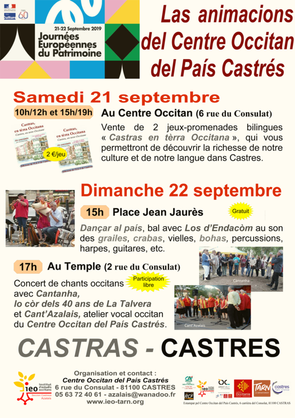 A l'occasion des Journées du Patrimoine, le Centre Occitan del País Castrés vous invite à un bal et à un concert occitans le dimanche 22 septembre 2019.