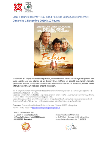 CINE «Jeunes parents*» au Rond Point de Labruguière présente: Dimanche 1Décembre2019 à 10 heures*Le concept est simple: un dimanche par mois, le cinéma donne rendez-vous aux jeunes parents avec leurs enfants pour une séance où un dernier film à l'affiche est projeté sous lumière tamisée,(permettant ainsi de se déplacer aisément avec bébé dans les bras en cas de besoin), volume sonore atténué avec même un matelasà langer à disposition.