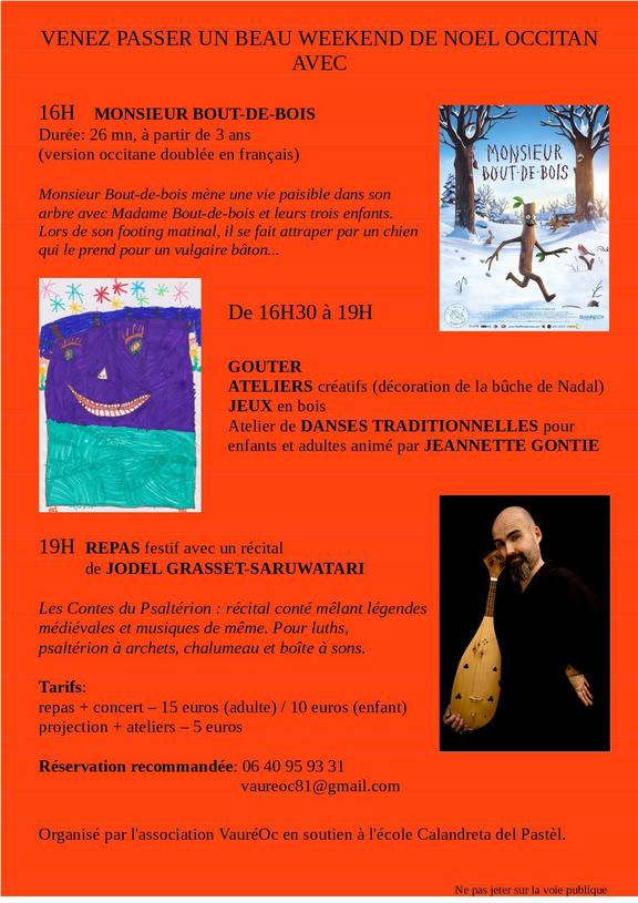 rendez vous, à la halle au grain à Lavaur, à partir de 16 hre pour un visionnage d'un film d'animation (Monsieur bout-de-bois) puis partager un gouter et des animations.A partir de 19 repas festif avec le conteur Jodel GRASSET-SARUWATARI. Réservation pour le repas au 0640959331