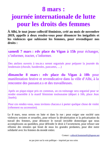 dimanche 8 mars : rdv place du Vigan à 10h pour manifestation festive et revendicative dans la ville d'Albi, à la rencontre des passant.e.s et des travailleuses.