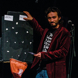 21h à la salle François Delga (proposé par la Scène Nationale d'Albi) Fort de différentes expériences artistiques, entre comédien et auteur, chanteur parfois slameur, Arthur RIBO commence à imaginer une forme nouvelle de spectacle où textes, chansons et histoires sont créés à vue, à partir des mots écrits par le public au marqueur sur des cartons distribués à l'entrée.