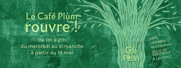 Après de longs mois de silence (trop!), le Café Plùm reprend toutes ses activités. En extérieur, du mercredi au dimanche de 11h à 21h, pour boire un verre ou partager un repas entre amis (espérons que le temps soit clément). Mais aussi pour profiter d'un concert dans notre salle de spectacle.