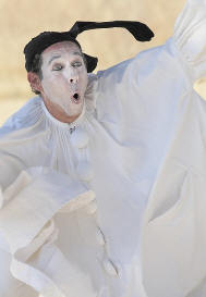 C'est un spectacle en cours de création, imaginé dans la pure tradition du spectacle de rue : un costume de pierrot, pas de décor hormis le décor urbain, une adresse au public à la fois verbale, gestuelle, et interactive.