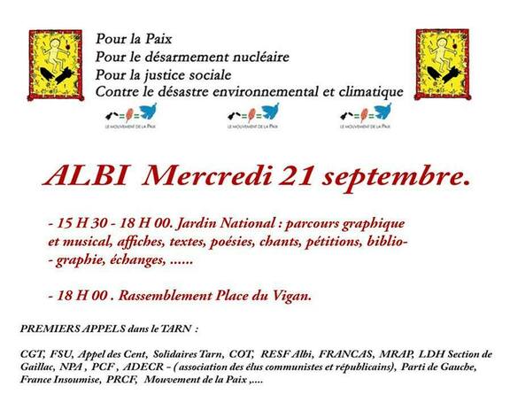PREMIERS APPELS dans le TARN : CGT, FSU, Appel des Cent, Solidaires Tarn, COT, RESF Albi, FRANCAS, MRAP, LDH Section de Gaillac, NPA, PCF, ADECR - ( association des élus communistes et républicains), Parti de Gauche, France Insoumise, PRCF, Mouvement de la Paix pour marquer symboliquement cette journée.