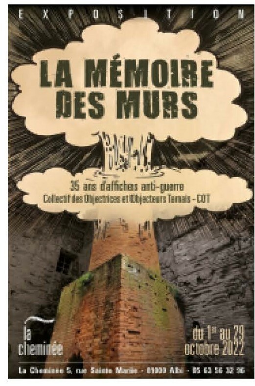 La cheminée expose les 95 affiches que le collectif des objectrices et objecteurs tarnais a réalisées et collées pendant une période de 35 ans. Conscription et l'insoumission, Vente d'armes basta, Nonà la guerre, Non à la symbiose éducation-armée