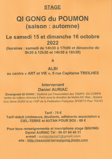 Pour tous renseignements et inscriptions stage Qi GONG: