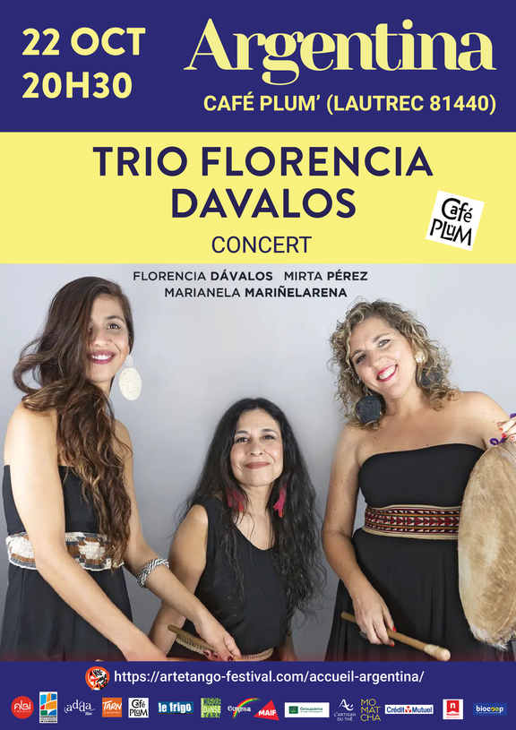 Musique d'Argentine du nord au sud !! une exploration toute féminine du répertoire folklore d'Argentine avec Mirta Perez au piano, Mariana Marinelarena aux percussions, et Florencia Davalos au chant ! un trio de choc pour un voyage-découverte des rythmes qui font l'Argentine ! concert en partenariat avec le Café Plum dans le cadre du festival ARGENTINA (Albi)