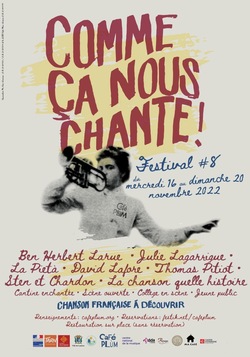 On vous dévoile enfin la programmation de la 8ème édition du festival "Comme ça nous chante !" au Café Plùm ! Cette année la chanson sera célébrée du 16 au 20 novembre 2022 avec sept concerts, une scène ouverte, une cantine « en chanson » et un spectacle jeune public !