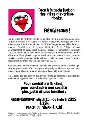 A l'initiative de plusieurs organisations, un rassemblement s'organise mardi 15 novembre à 18h Place du Vigan à Albi pour lutter contre la propagation d'idées haineuses, racistes et homophobes.