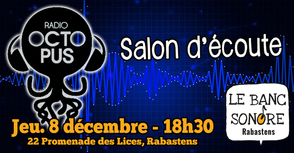Le Salon d'écoute est un rendez-vous régulier proposé par Radio Octopus. D'une durée d'1h environ, c'est un moment dédié à l'écoute partagée de créations radiophoniques en tous genres.