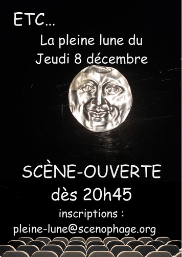 Pour les artistes, cette prestation pourra servir d'audition pour une programmation future, il vous suffit de vous présenter le soir même! Bien-sûr, si vous nous préveniez par téléphone ou mail à l'adresse suivante pleine-lune@scenophage.org l'organisation s'en trouverait simplifiée! Mais bon, nous affectionnons la spontanéité! Et les points d'exclamation.