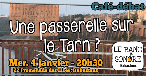 La SEPRA vient nous parler du projet de passerelle piétonne au dessus du Tarn, déjà discutée il y a quelques temps mais qui ne semble pas avancer. Qu'est-ce qui coince ? Combien ça coûte ? Comment se mobiliser pour que ça avance ? On parlera de tout ça ce soir.