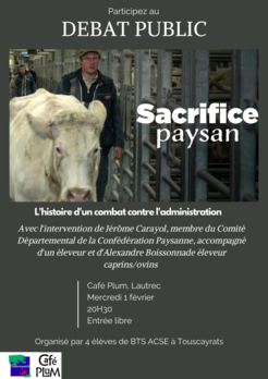 La soirée se déroulera en deux parties : visionnage du documentaire « sacrifice paysan » suivi d'un débat autour de la problématique « Les contrôles peuvent-ils être la raison de certains sacrifices en agriculture ? »