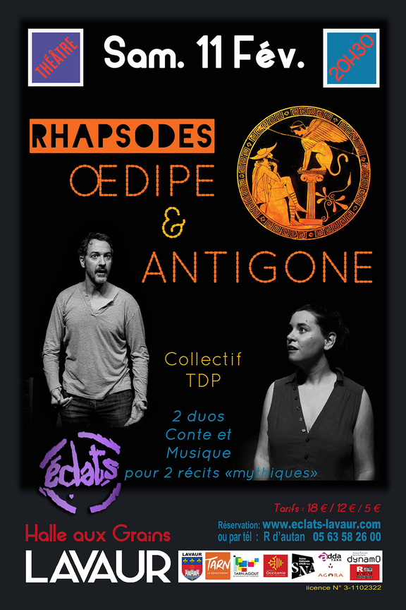 Rhapsodes c'est un spectacle complet composé de deux récits chantés et accompagnés de musiciens. Sébastien Portier fait revivre Oedipe avec fougue, humour et émotion. Venu de la lointaine Grèce antique, le mythe semble soulevé par un vent de fraîcheur. On en ressort bouleversé; On est captivé et ému par le destin de cette figure héroïque , Antigone, qu'Eglantine Jouve nous rend si proche et si contemporaine.