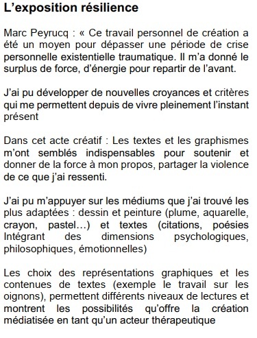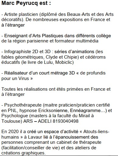 Marc Peyrucq présente son travail sur la résilience le vendredi 21 Avril lors de la soirée organisée par les Psy-causent à la halle aux grains de Lavaur " Qu'est-ce que je fais-là?" Dans les pas de pierre Delion" à partir de 19H30