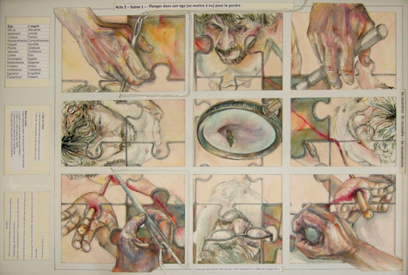 Dans cette série de panneaux il est question de souffrance, de perte de repères, de la fragmentation du corps et de l'esprit, du poids du vécu, de résurrection et de reconstruction faisant suite à des prises de conscience.