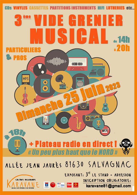 Dans le cadre de la semaine de la fête de la musique et de la fin des cours de musique, l'association KARAVANE et le CAFÉ AU BORD DU MONDE, lancent le 3ème VIDE GRENIER MUSICAL, ouvert aux pros et aux particuliers.