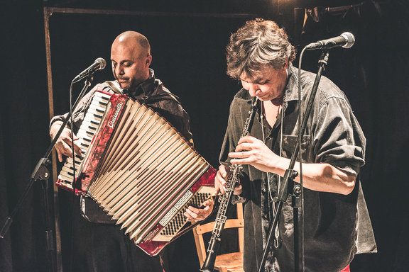 Duo de chanson française à texte accompagnée à la guitare et à l'accordéon, et mise en valeur par d'inattendus instruments à vent : hautbois, hautbois baryton, saxophone ténor.