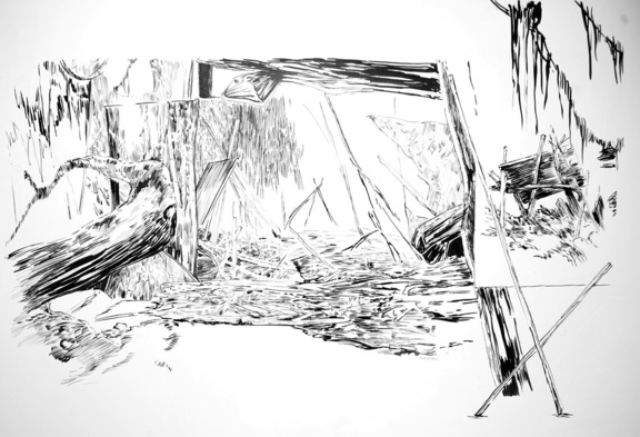 Au Frigo, lieu culturel associatif en centre-ville d'Albi, l'exposition fait échos aux œuvres exposées sur les berges du Tarn et à Pratgraussals. Les dessins virtuoses de David Coste se déploient sur les murs mais aussi dans l'espace d'exposition. On y retrouve les paysages que l'artiste a parcourus à Albi mais aussi l'imaginaire de l'île déserte, du radeau précaire, du temps qui passe...