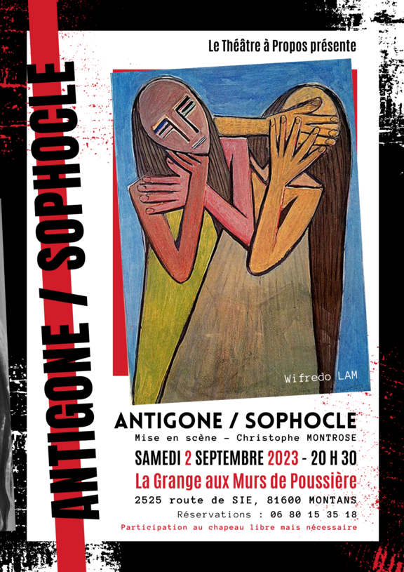 "Venez écouter le bruit sourd de la révolte contre un état en pleine décrépitude. Antigone est une tragédie qui fait s'affronter deux mondes : l'héroïne refuse de se soumettre à l'ordre du tyran qui représente la loi de la cité et même la menace de mort ne la fera pas se taire."