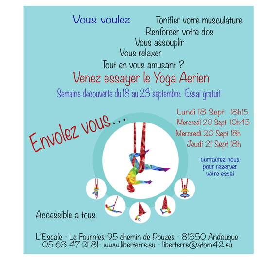 la rentrée de Yoga aérien à l'Escale à Andouque se profile: Je vous invite à venir vous envoler avec Liber'Terre!! Semaine découverte a partir du 18 Septembre.