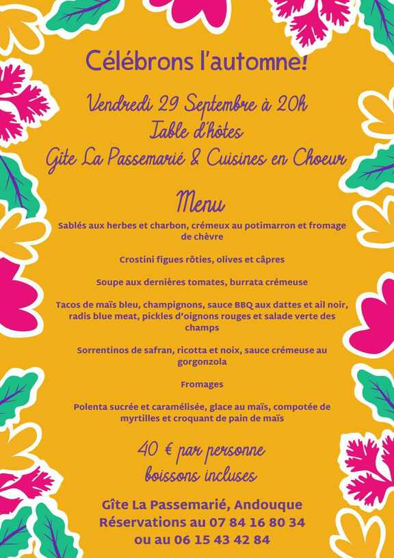 L'automne arrive à petits pas, nous te proposons donc une soirée cocooning aux Gîtes la Passemarié avec les bons petits plats super généreux de Audrey de Cuisines en Choeur pour te régaler les papilles et le coeur !