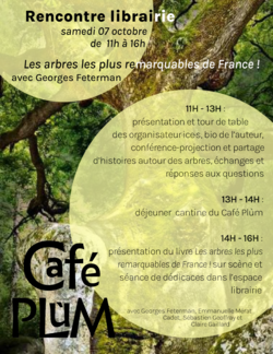 Georges Feterman, auteur et président de l'association A.R.B.R.E.S. (pour la découverte d'arbres d'exception, la recherche et leurs sauvegarde), sera à la librairie du Plùm pour une journée d'échanges et de récits autour des arbres. Il viendra nous présenter son ouvrage "Les arbres les plus remarquables de France !"