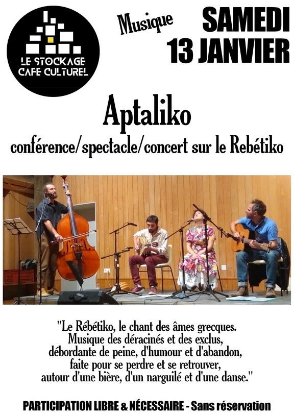 "Aptaliko est un groupe qui s'est formé dans les Cévennes par la rencontre d'un breton, d'un cévenol, d'un albigeois et d'une grecque, autour d'une musique née des bas-fonds du port du Pirée au début du siècle dernier : le Rébétiko. Musique des déracinés et des exclus, débordante de peine, d'humour et d'abandon, faite pour se perdre et se retrouver, autour d'une bière, d'un narguilé et d'une danse."