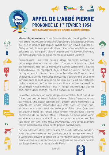 A l'occasion des 70 ans de l'appel de l'hiver 54 de l'Abbé Pierre, nous organisons un rassemblement place du Vigan à Albi, le jeudi 1er février de 17h à 20h. Seront également présents d'autres associations luttant chaque jour contre toute forme de précarité (Restos du coeur, Secours Catholique, Secours Populaire, Ba,que Alimentaire...).
