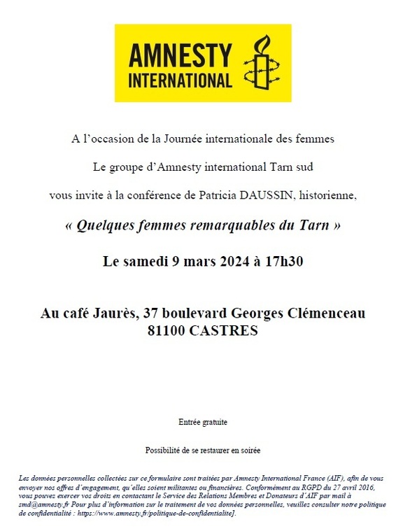 A l'occasion de la Journée internationale des femmes, le groupe d'Amnesty du Tarn sud propose une conférence sur "Quelques femmes remarquables du Tarn" présentée par Patricia DAUSSIN, historienne.