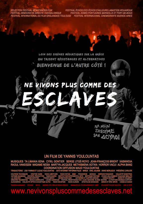 Venu des catacombes grecques de l'Europe, un murmure traverse le continent dévasté : « Ne vivons plus comme des esclaves » (prononcer « Na mi zisoumé san douli » en grec). Sur les murs des villes et sur les rochers des campagnes, sur les panneaux publicitaires vides ou détournés, dans les journaux alternatifs et sur les radios rebelles, dans les lieux d'occupation et d'autogestion qui se multiplient, tel est le slogan que la résistance grecque diffuse, jour après jour, et nous invite à reprendre en chœur sur les mélodies de ce film à ses côtés. Un grand bol d'air frais, d'enthousiasme et d'utopies en marche, venu de la mer Égée.