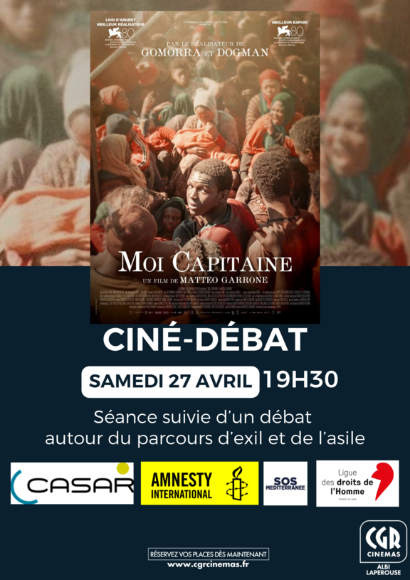 A l'occasion de la sortie du film « Moi Capitaine », le CASAR, en partenariat avec SOS Méditerranée, la Ligue des Droits de l'Homme, Amnesty International et la Fédération des Acteurs de la Solidarité, vous invite à une soirée débat à la suite du visionnage du film « Moi Capitaine », autour des questions de l'exil et de l'asile.