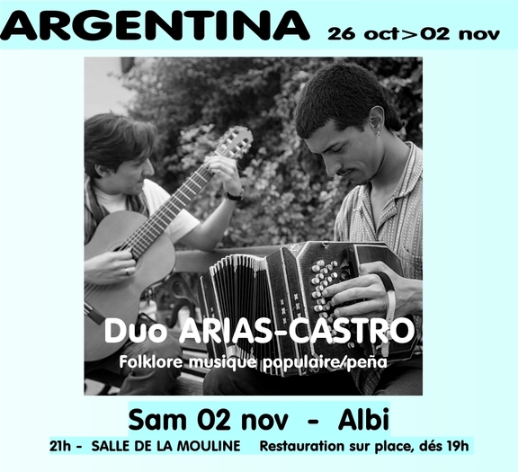 Nous recevrons dans le cadre du festival ARGENTINA un DUO d'exception en tournée en Europe : le DUO Santiango ARIAS, bandonéon et Sebastian CASTRO, guitare et voix.