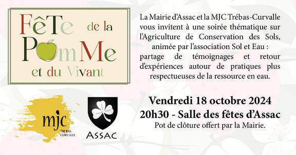 Dans le cadre de la fête de la pomme, une soirée thématique est proposée sur l'agriculture de conservation des sols. L'association Sol et eau apportera des témoignages et retours d'expériences.