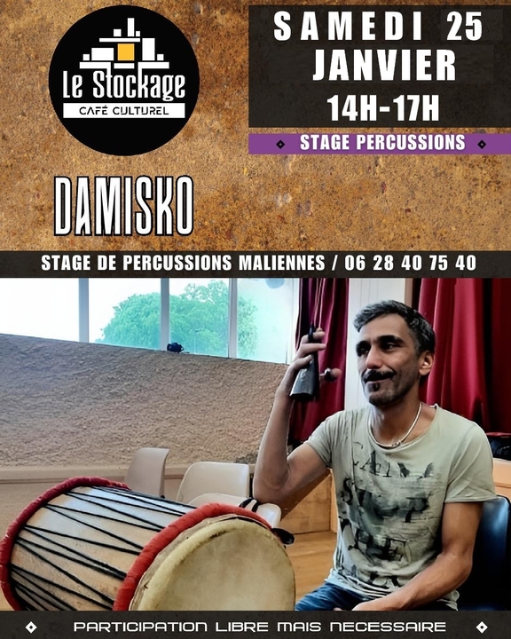 Prochain stage de percussions Maliennes au 𝕊𝕥𝕠𝕔𝕜𝕒𝕘𝕖 avec Damien Damisko le 14 décembre de 14h à 17h !!!