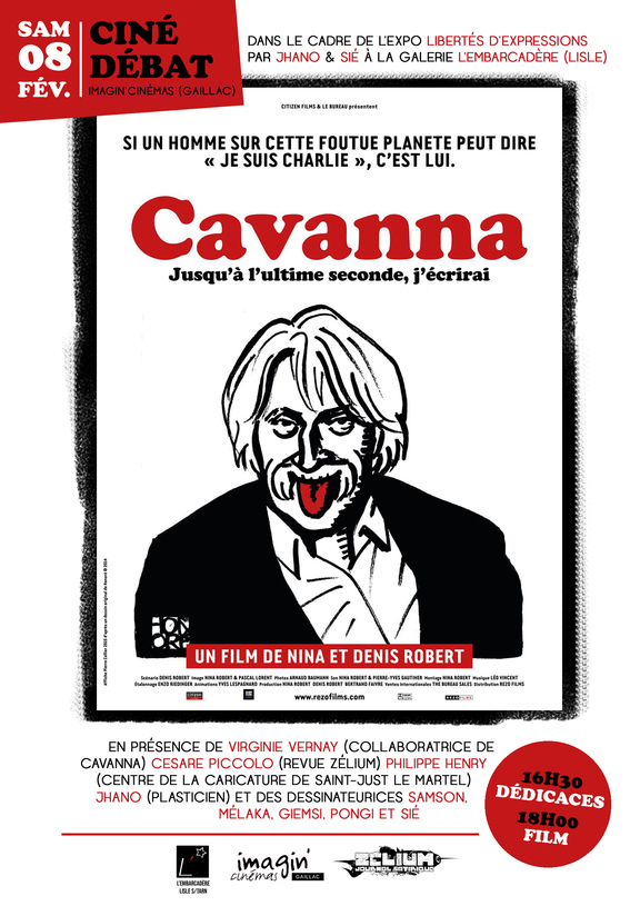 Dans le cadre de l'exposition Libertés d'expressions de Jhano et Sié à la Galerie L'Embarcadère de Lisle-sur-Tarn, rendez-vous ce samedi 8 février à l'Imagin' Cinémas de Gaillac pour un ciné-débat autour du film Cavanna, jusqu'à l'ultime seconde j'écrirai de Nina et Denis Robert.