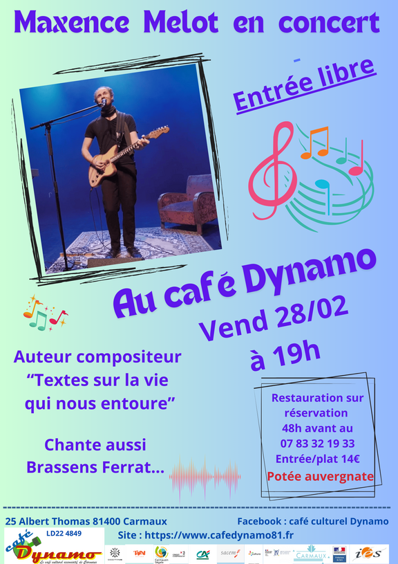 DINER CONCERT AU CAFE CULTUREL DE CARMAUX AVEC MAXENCE MELOT AUTEUR -COMPOSITEUR-INTERPRETE