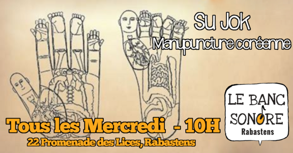 À partir d'avril, tous les mercredi matin de 10h00 à 12h00 Marjo vous propose une séance de Su Jok pour soulager vos douleurs (problèmes digestifs, maux de tête, gorge, dents, entorse, fatigue, rhume, insomnies...).