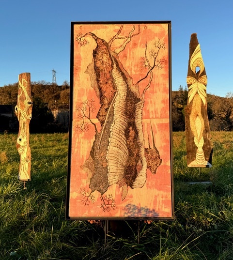 Influencée par l'art pariétal, Corinne aime explorer le bois comme révélateur d'une nature primaire, ensevelie et comme enfouie par nos mondes industriels et numériques.