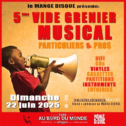 Dans le cadre de la semaine de la fête de la musique, l'association LE MANGE DISQUE et le CAFÉ AU BORD DU MONDE lancent le 5ème VIDE GRENIER MUSICAL, ouvert aux pros et aux particuliers !