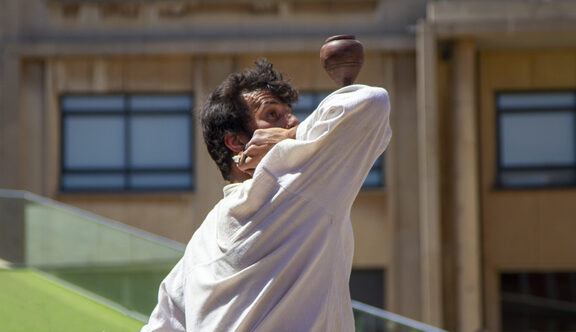 En fabriquant lui-même ses toupies, le majorquin Guillemn Vizcaíno fusionne les arts du cirque avec le jeu populaire : la toupie est alors une actrice d'introspection, de découverte de soi et de différenciation des autres. Entre artisanat, jeu de l'enfance et jonglage, il invente un cirque résolument contemporain qui nous donne à voir toutes les racines de la culture méditerranéenne.