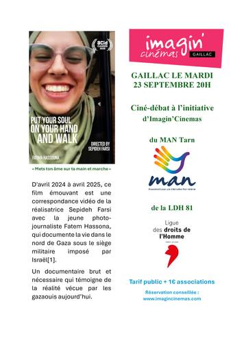 A l'occasion de la sortie nationale du film de Sepideh FARSI ) Put your soul on your hand and walk (https://www.allocine.fr/film/fichefilm_gen_cf…), Imagin'Cinéma, le MAN (Mouvement pour une Alternative Non violente) et la LDH (Ligue des Droits de l'Homme) organisent une avant-première Mardi 23 septembre à 20h. Après la projection, le débat permettra aux associations présentes et au public d'échanger sur la réalité vécue par les gazaouis et le contexte.