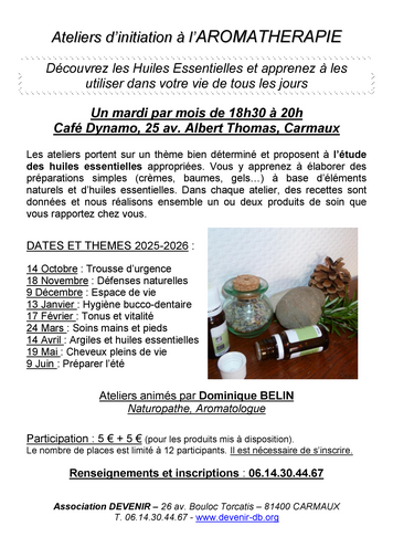 Un mardi par mois de 18h30 à 20h, l'association Devenir propose des ateliers d'initiation à l'Aromathérapie sur un thème déterminé.