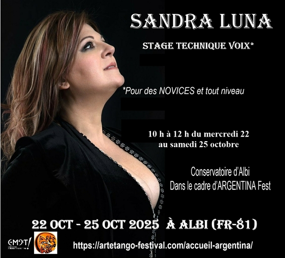 La Maestra Sandra LUNA, chanteuse très connue en Argentine, conduira pour la 10ème année, un stage TOUT PUBLIC destiné aux personnes qui souhaitent utiliser leur voix : chanter, conter, lire à hautre voix, etc... du 22 oct au 25 oct le matin de 10h à 12h elle proposera divers exercices pour trouver, écouter, comprendre, accepter, projeter... SA voix !! avis à tous les chanteurs, la pédagogie de Sandra LUNA est unique... et vaut le détour !