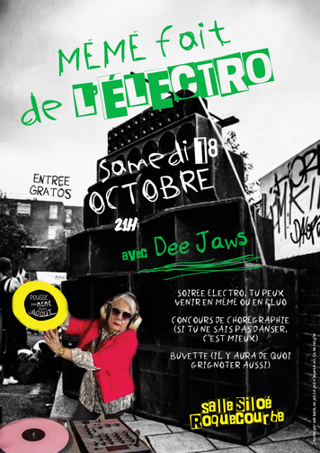 Soirée electro à la salle siloe avec Dee Jaws, entrée gratos, venez déguisé en mémé ou en fluo pour nous faire une belle chorégraphie, à boire, à grignoter....