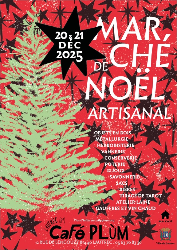 Le weekend du 20 & 21 décembre, tout le village de Lautrec est en fête pour le Marché de Noël ! Et pour l'événement, le Café Plùm invite lui aussi une dizaine d'exposant·es de TALENT ; artisan·es, producteur·ices et créateur·ices locaux, le samedi de 12h à 20h et le dimanche de 10h à 18h.