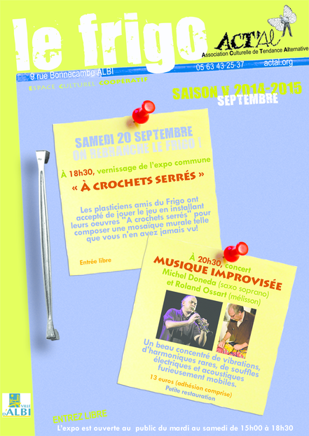 Dès 18h30 s'ouvrira la première exposition de la saison V, pour laquelle une vingtaine d'artistes plasticiens ont accepté de confier leurs oeuvres au mur du Frigo: Edwige Armand, Thierry Boyer, Marie Catalogne, Hakim Chougar, Pascale Drivière, Roselyne Duchon, Claire Foltète, Delphine Gobin, Cécile Guyonneau, Karolinda, Katalin Lukacs, Suzanne Midroit, Christian Moreno, Anne Nourian, Roland Ossart, Vivette Pons, Jean Pierre Touillez, Jacques Trouvé.