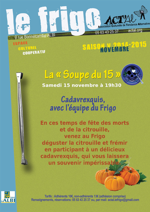 Venez donc vous réchauffer au Frigo grâce à la grande Soupe du 15, suivie d'un "Cadavrexquis" que nous accrocherons ensuite sans remords à nos murs!