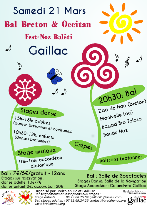 Réservez dès à présent votre samedi 21 mars 2015 pour ce rendez-vous avec les danses et musiques bretonne et occitane et ainsi fêter le printemps en toute convivialité et dans la bonne humeur.